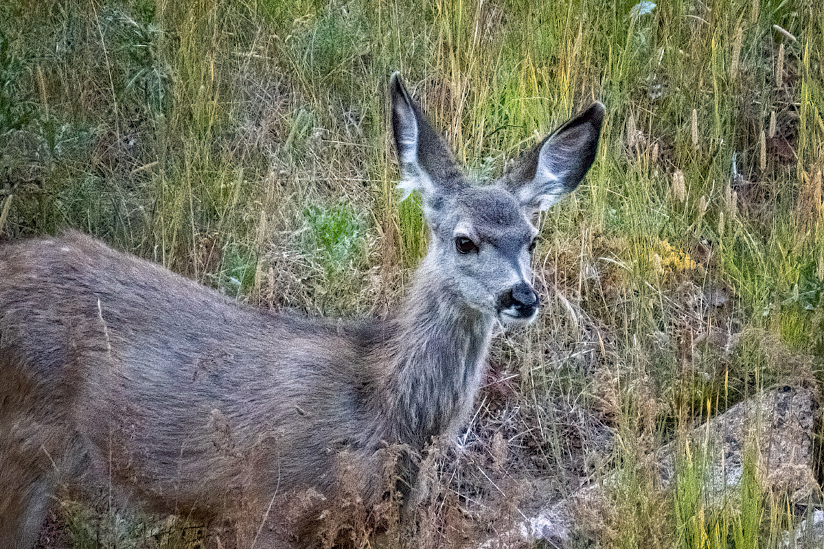 We see both Mule Deer and White-tailed Deer all the time in our backyard, but we are still excited to see them. The fist night at dusk, there was a mother Mule Deer with her baby just across the river. I thought the unique coloration of the baby’s face was just beautiful. I hadn’t seen one with black ears and black forehead with the line running down the nose. (Sorry about the grainy photo, but the camera doesn’t do well in low light.)
